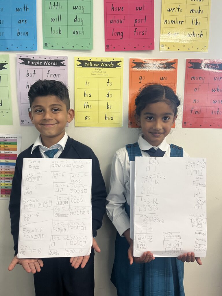 Year 3B has been exploring times tables and division facts by building arrays and connecting them to related fact families. Students are learning what the tables represent and the importance of quick recall.